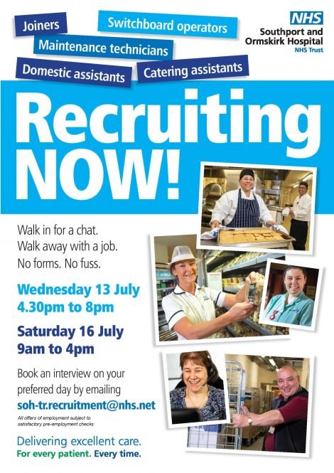Southport and Ormskirk hospitals are offering jobs on the spot for the right candidates who turn up to recruitment events for support staff being held this month.